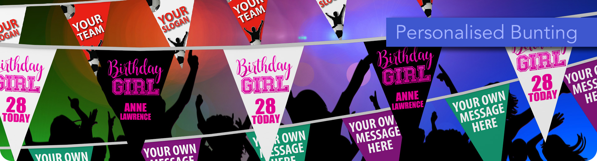 Bunting and hand waving flag specialists based in Northampton, England producing bespoke products to both commercial clients and the general public. With a large range of bunting available at our online store some of which can be personalised, we have something for all occasions be it a corporate event or a family members birthday party.